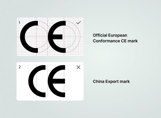 Comme vous le voyez ici à gauche, il y a deux petites différences entre les marquages : 1. Sur le logo « CE » (premier logo), il y a un espace clair entre les deux lettres. Sur le logo « China Export », il n’y a pas d’espace entre les deux lettres. 2. Sur le logo « CE », la barre centrale de la deuxième lettre est légèrement plus courte que les deux autres barres. Sur le logo « China Export », la barre centrale de la deuxième lettre est de la même longueur que les deux autres barres.